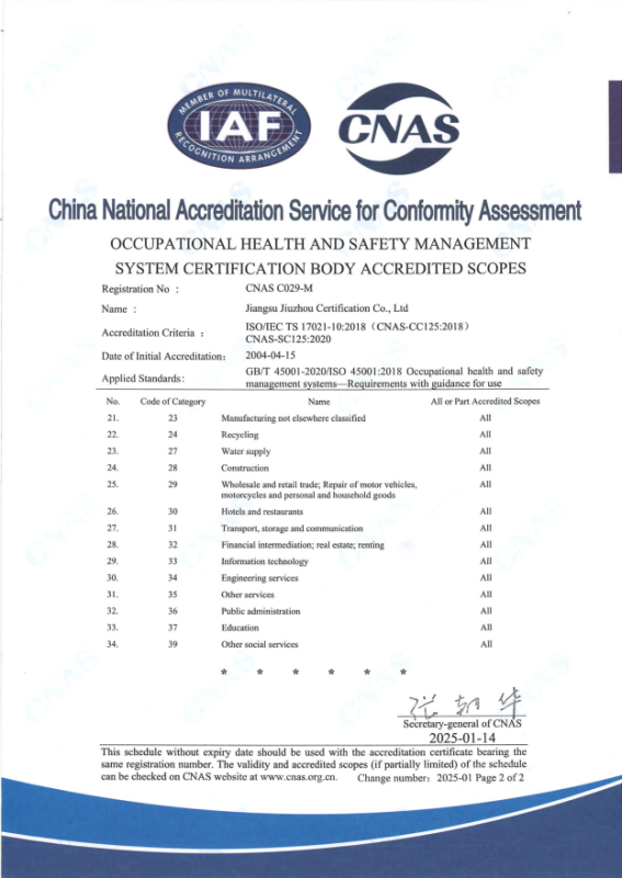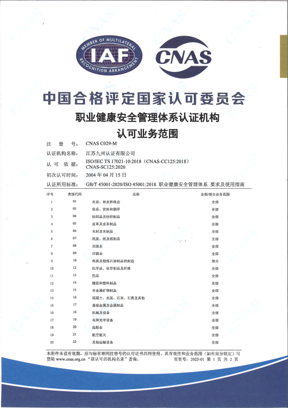職業(yè)健康安全管理體系認可業(yè)務范圍-中文2